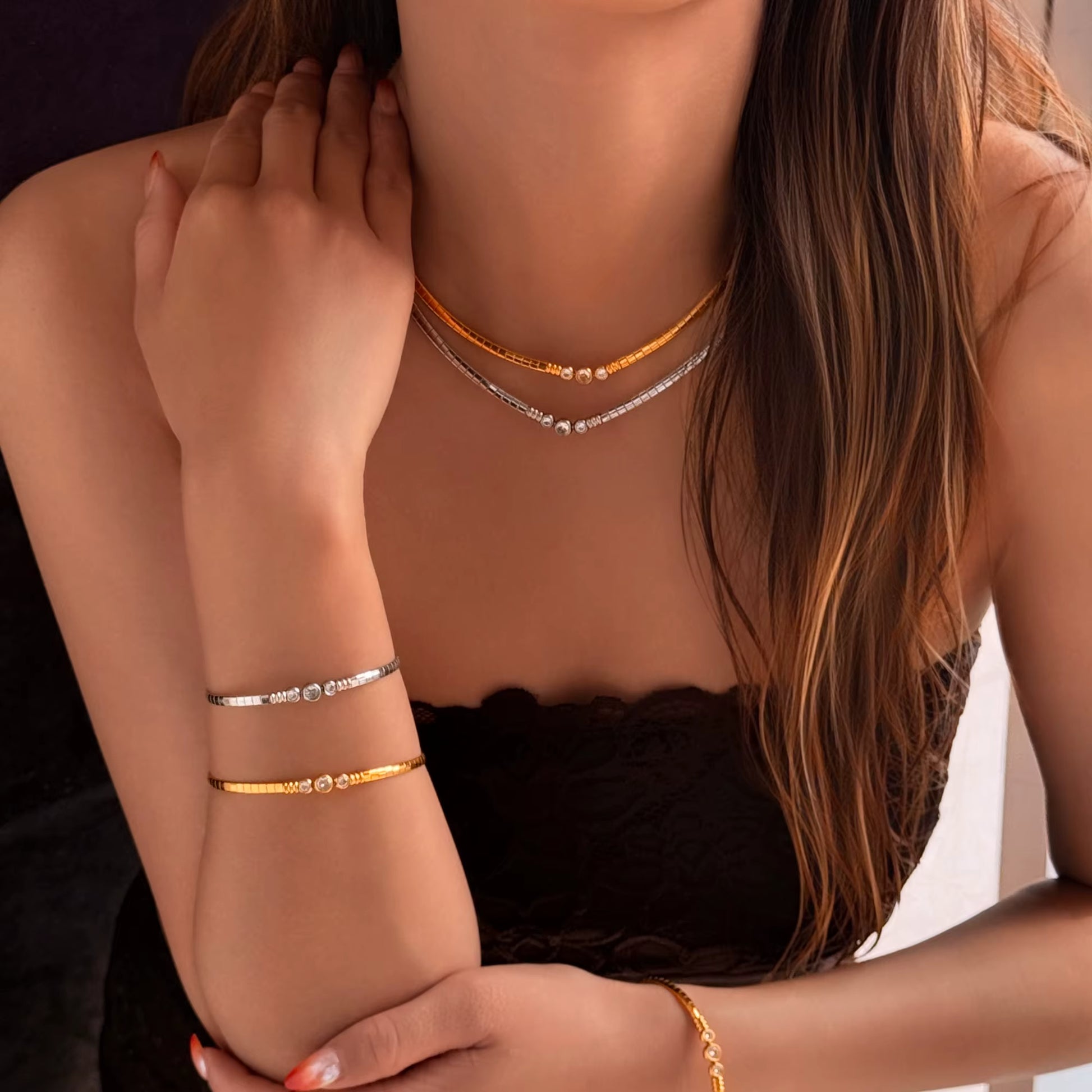 This Zircon Chocker Stackable Necklace and Anklet Set combines minimalist design with premium craftsmanship, featuring sparkling cubic zircon stones that add subtle elegance to any outfit. Crafted from 316L stainless steel and plated with 18K PVD gold and silver, this set offers durability and a luxurious finish. Ideal for sensitive skin, it is nickel-free, hypoallergenic, and resistant to tarnishing, ensuring long-lasting wear without irritation. Perfect for layering or wearing alone, this versatile set enhances your style with a refined, contemporary touch.